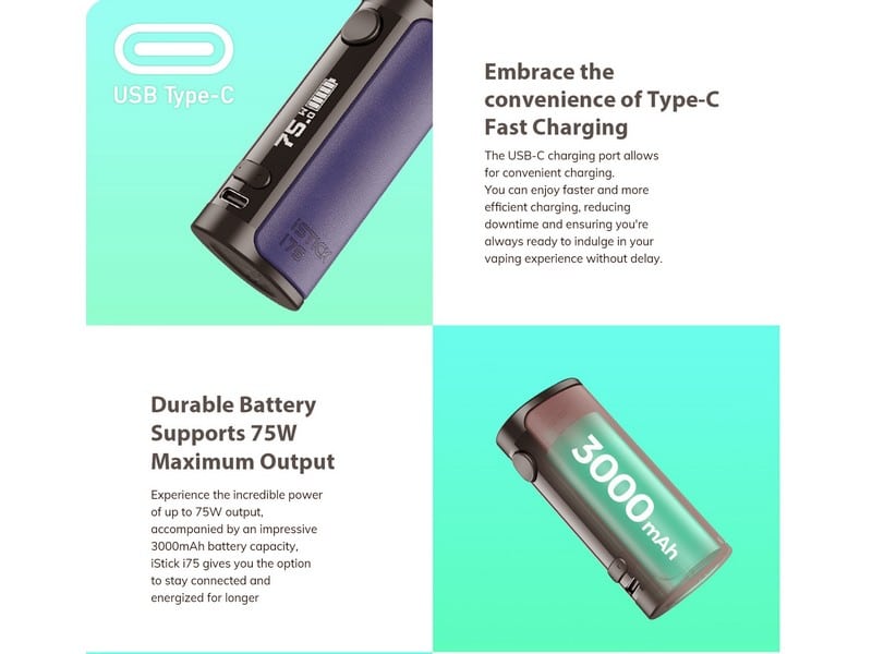 Dotée d’une batterie intégrée de 3000mAh, cette box iStick i75 Eleaf offre une endurance exceptionnelle qui permet de vapoter toute la journée sans interruption. Aussi sa capacité de recharge rapide via son câble USB-C en 2A optimise le temps de charge.