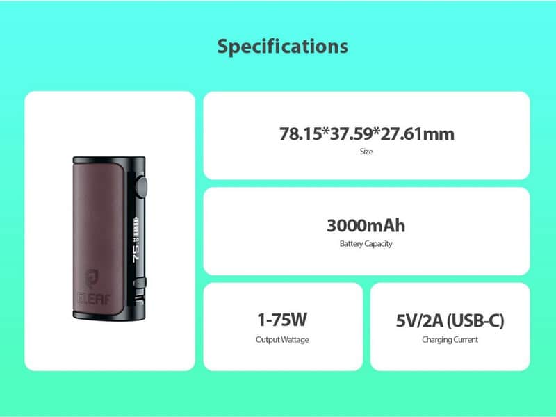Avec ses dimensions compactes (78.2mm de hauteur, 38mm de longueur, 28mm de largeur) et un poids léger de 116g, la box iStick i75 3000mAh Eleaf s’impose comme un compagnon idéal au quotidien.