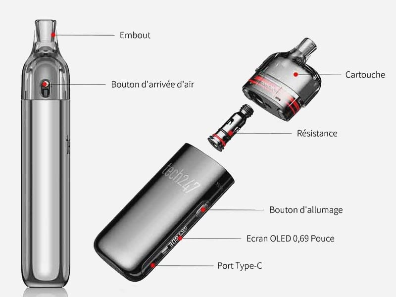Fonctionne avec sa cartouche Tech247 qui propose pas moins de 4ml de contenance, facilement rechargeable en e-liquide par le haut. Munie d’un airflow réglable pour une inhalation polyvalente, elle utilise les résistances M-Coil de la marque.