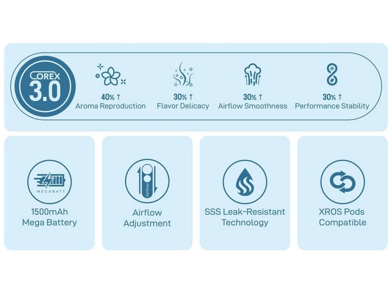 La nouvelle cartouche XROS Corex 3.0 bénéficie d’un mesh en nid d’abeille, d’un design de cheminée repensé et de matériaux résistants à haute température permettant une meilleure restitution des saveurs, une chauffe plus homogène, et une durée de vie prolongée des résistances.